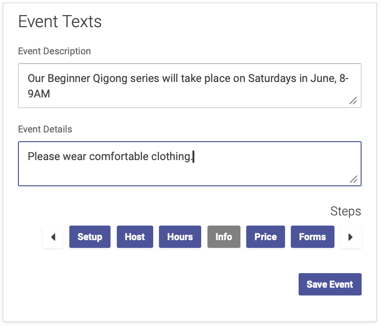 Click the right arrow at the bottom of the page to advance to the next step: Event Info