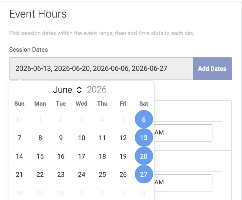On the Hours page, you'll enter the hours for each of your separate dates. Click the box below "Session Dates" and a drop-down calendar will appear. Click dates on the calendar to select each date of your multi-day event, then click Add Dates: