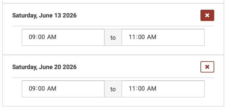To delete a date from your multi-day event, click the X box next to the event date (note: you cannot delete the start or end date of a multi-day event):